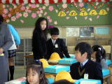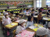 初めての給食は、カレーライスでした。38人分+先生分を配膳するのは、とても大変です。こぼさないように慎重に、お仕事をがんばっています。