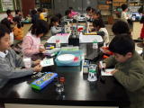 写真は、魚つりのお店を出したグループの様子です。魚を釣ると、裏にクイズが書かれています。中には「はずれ」と書かれていたものもありました。