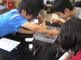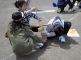 火打ち石やまいぎり式の火起こし道具を使って、火起こしに挑戦しました。結構根気のいる作業でしたがどのグループも火をおこすことができ満足していました。 |