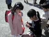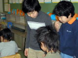 登校してきた1年生を教室で迎え、朝の支度を手伝います。何を手伝っていいのか最初は戸惑いがちでしたが、慣れてくると、合間を見て本の読み聞かせをするようにもなりました。 |