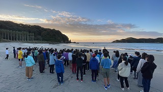 | 1日目 6時45分出発式 予定通り弓ヶ浜に向けて出発しました。いってらっしゃーい! | |
