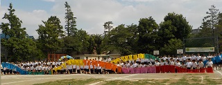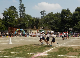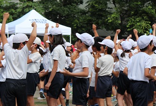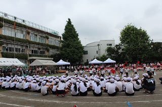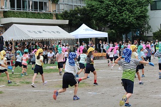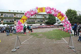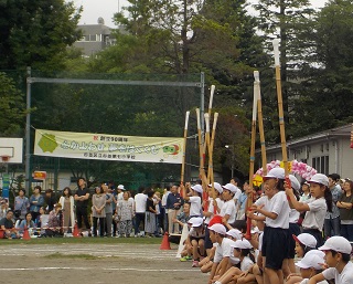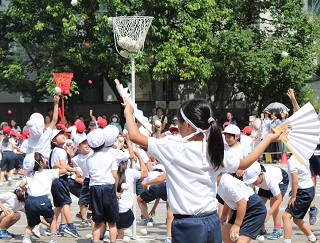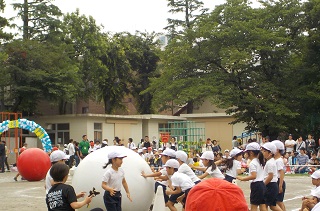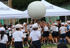 全校競技大玉送り。こんなところにも、90周年記念キャラクター「杉七どん」