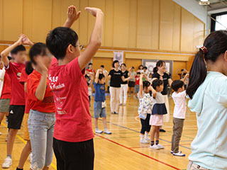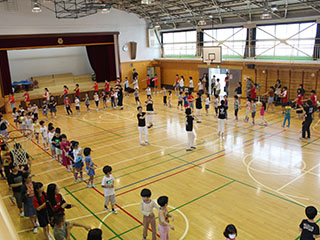 | 盆おどりのチーム「盆楽」のみなさんに、体育館で盆おどりを教えてもらいました。6年生に 1年生とペアを組んでサポートしてもらったことも功を奏して、「杉七音頭」と「東京音頭」「炭坑節」の3曲を楽しく覚えることができました | |