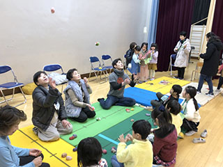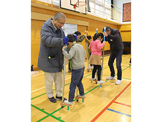 | 町会をはじめとする地域の50名の方に「昔遊びコーチ」をお願いして教えてもらいました。こま、ベーごま、けん玉、ビー玉、めんこ、おはじき、お手玉、あやとり、はねつき、竹馬の10 種目に挑戦。コーチに励ましてもらって、意欲的に取り組むことができました。 | |