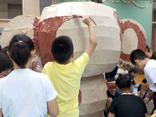 | パールセンターの方に教えてもらって、4年生が毎年「はりぼて」を作ります。図案を描き、 木材を切り、釘を打ち、針金で骨組みを作り、紙を貼り、色を塗るまでの全工程に取り組みます。1組は「杉七90さる」 2組は「幸せ七グマ」を8月3日〜7日の七夕祭に展示しました。 |