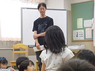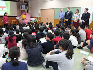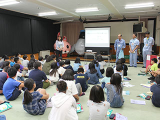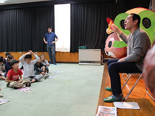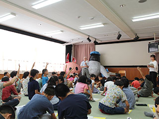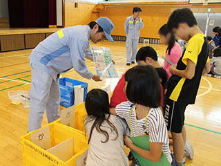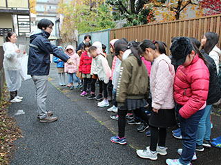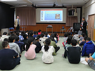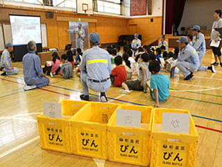 | 杉並清掃事務所からゲストティーチャーチームをお迎えした当日は、あいにくの雨。ごみ収集体験車は来ませんでしたが、雨用のプログラムが用意されており、清掃事務所のみなさんオリジナルのパワーポイント教材と「分別クイズ」で、しっかり学習できました。 | |