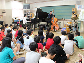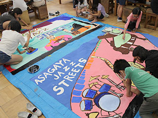 | 「阿佐谷ジャズストリート」について実行委員の方のお話を聞き、資料を調べて壁新聞を作りました。また、プロによるジャズ生演奏を鑑賞し、ジャズのリズムを手拍子で体感。 「ジャズフラッグ」を制作して商店街に飾り、イベントの盛り上げに貢献できました。 |