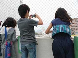 | まず、学校の屋上から周囲を観察。さらに高いところから町の全体を観察できるポイントを求めて、阿佐ヶ谷中学校(屋上)と新東京会館(社長室)から町を俯瞰しました。杉並第七小学校、中央線、中杉通り、消防署、荻窪のビル群を確認できました。 | |