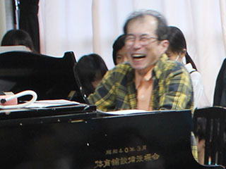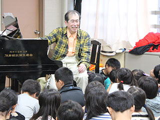 | 藤江さんが6年生の時の運動会で「トランペットのファンファーレを友だち3人で演奏したい」と作った曲が、今の仕事の原点だそうです。ほかに、同じころ特撮ファンの同級生のために作曲したピアノ曲『甦ったドクロ』を聞き、最後に「校歌」を全員で歌いました。 | |