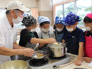 | 大豆から豆腐を作りました。先生は、川上豆腐店の小坂田元文さん。卒業生保護者です。豆腐作りの決め手は「にがり」の量。小坂田さんに豆乳の状態を見ながら「にがり」の量を調整してもらい、全ての班で良い加減に固まり、おいしい豆腐を試食できました。 | |