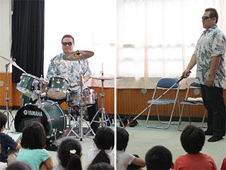 | 全盲のドラマー佐藤尋(ひろ)宣(のり)さん夫妻をゲストティーチャーにお招きしました。 視聴覚室で佐藤さんのドラム演奏を鑑賞し、お話を聞き、ドラムと合唱で交流しました。その後、4年生が佐藤さんを多目的室へご案内し、一緒に給食をいただきました。 |