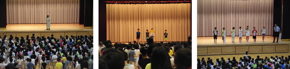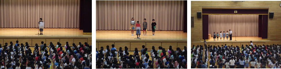 7月19日(金)に、体育館で1学期の終業式を行いました。 校長先生からは、「1学期、みなさんの成長をたくさん実感しました。自分のがんばりに自信をもって、有意義な夏休みをすごしてください。」との言葉がありました。 そのあと、3年生の代表児童が、1学期にがんばったこと、2学期にがんばりたいことを発表しました。
