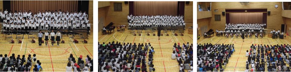 中学年、高学年、低学年と分かれて歌い、それぞれの歌のよさを聴きあったあと、全校で歌いました。 梅雨空を吹き飛ばすような、すてきな歌声が、体育館いっぱいに響き渡りました。 |