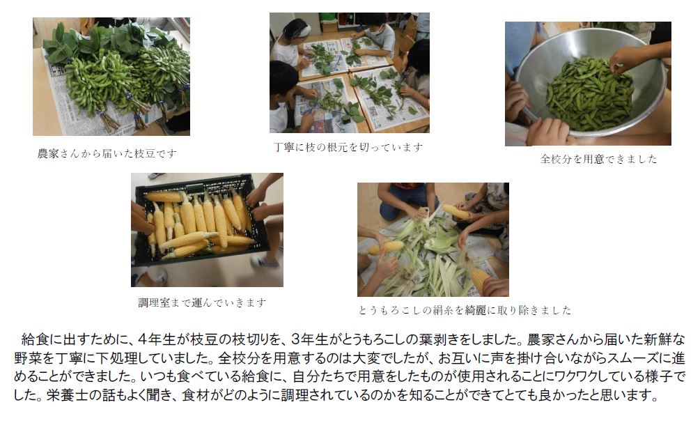 令和5年7月13日(木)18日(火) 食育(3・4年)給食に出る野菜の準備をしました