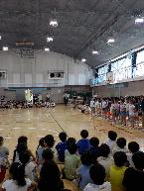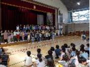 <7月4日(木)音楽朝会がありました> この日は、1学期のまとめとなる最後の音楽朝会がありました。今年度は、音楽朝会の内容を充実させようと考えています。1年生から6年生まで、音楽の時間などで取り組んできた歌の発表を学年ごとに行いました。1年生は、手話を付けて「にじ」を歌いました。 各学年、きれいな歌声が体育館に響きました。 |