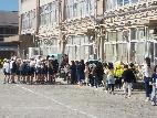 <あいさつパワーアップ週間を 行っています> 学期始めには、朝の登校時に併せて正門前に児童が整列して行うあいさつ運動を行っています。今日は、集合時刻よりもずいぶん前に来て、一人、顔をあわせる人たちに「おはようございます」とあいさつしている児童と出会いました。看護当番の先生からは、「あいさつは人と人を結びつける魔法の言葉」というお話がありました。 |