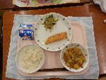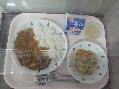 献立は、人気のカレーライス。4時間目を使って先生から配膳の仕方について説明を聞きながら、準備をしました。初日にもかかわらず、短い時間で準備ができ、おいしくいただくことができました。
