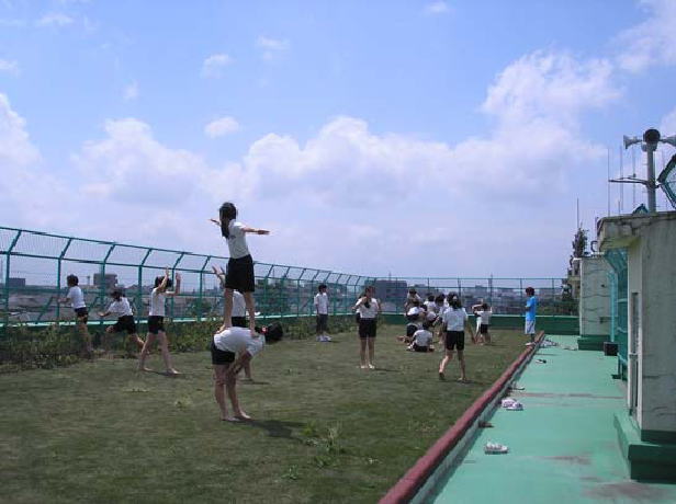 屋上の芝生は、運動会の組体操の練習にもってこいです。5,6年生が休み時間に進んで練習をしています。