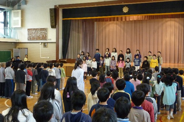 月に1回、音楽朝会をしています。 この日は、『気球に乗ってどこまでも』を歌いました。 口を大きく開けている子、楽しく歌っている子などは、 前のひな壇に乗ってもらい、皆から大きな拍手をいただきました。