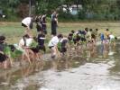 フレンドシップスクール1日目、午前中は飯盒炊飯でカレー作りを行いました。火おこしから始め、煙い中、おいしいカレーができあがりました。午後は田植えを行いました。裸足で田んぼに入り、泥だらけになりました。秋にはお米が送られてきます。