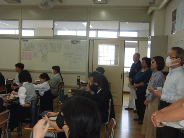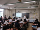 今日も学校公開の様子を紹介します。写真は1年生の数学、正の数・負の数についての学習です。中学生になると、-(マイナス)の概念を学習の中で取り扱い始めます。身近なところで見られる-の数字をみんなで出し合いながら、学習を進めていました。学習内容をそれぞれ自分事として捉えている様子がよく見られました。