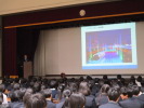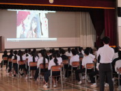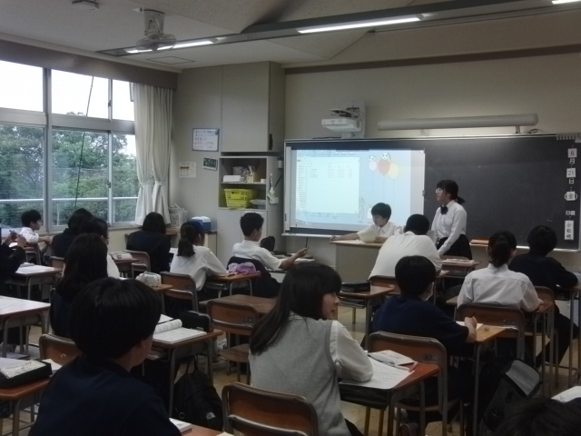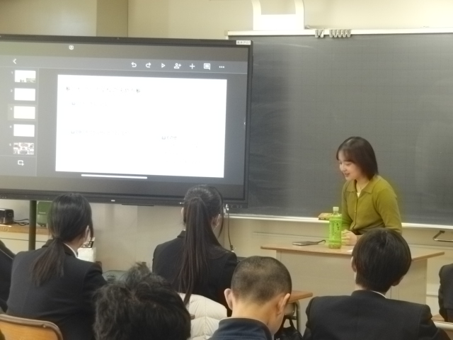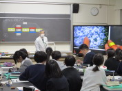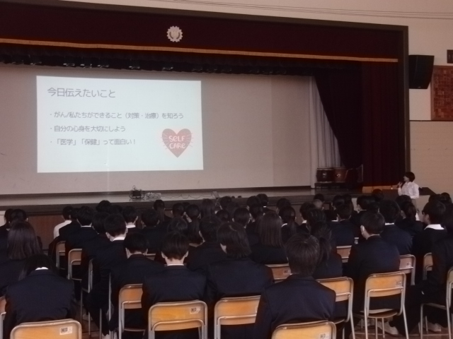 「がんを学ぼう」をテーマに東京大学医学部附属病院放射線科助教 南谷優成先生にご講演いただきました。2人に1人ががんになる現状、予防と早期発見が大切で、中学生では食生活と運動、適正体重の維持、子宮頸がんについてはワクチンが有効であること、そして対象年齢になったらがん検診を受けることが重要だと学びました。