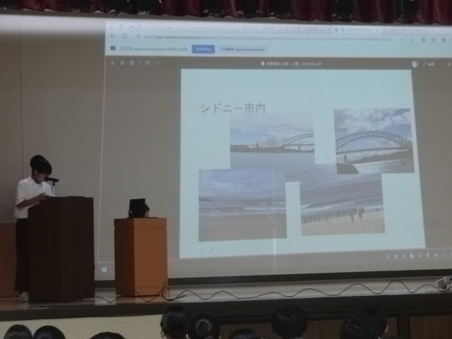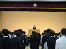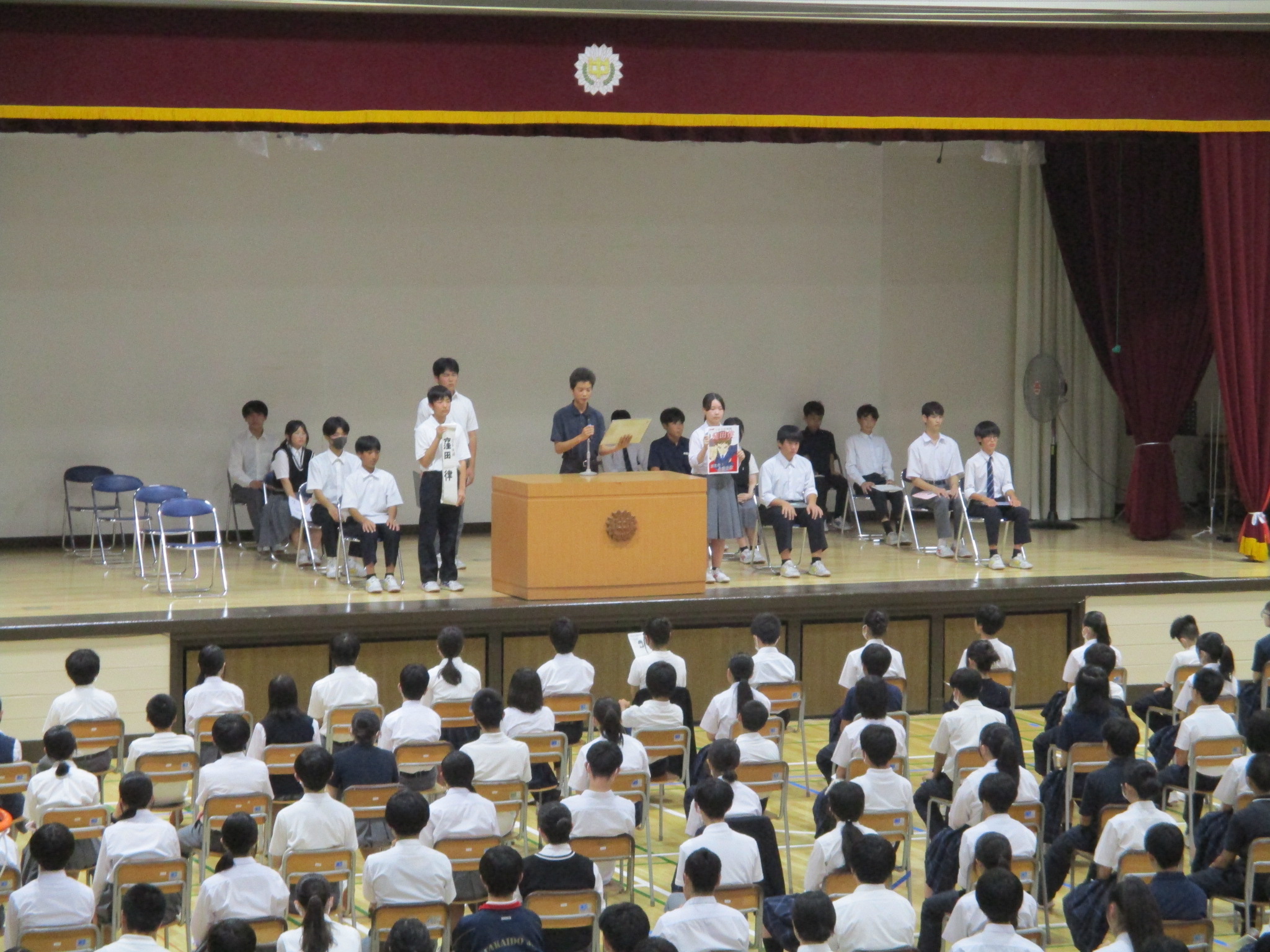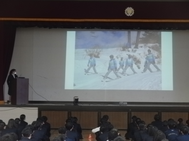 今日は生徒朝礼があり、2年生の菅平スキー教室の報告がありました。スキー教室のスローガンや内容などをプレゼンテーションソフトを使い説明してくれました。1年生には大変参考になったと思います。また、生徒会から意見箱の使い方について説明があり、ルールを守って意見箱を活用してほしいと伝えました。