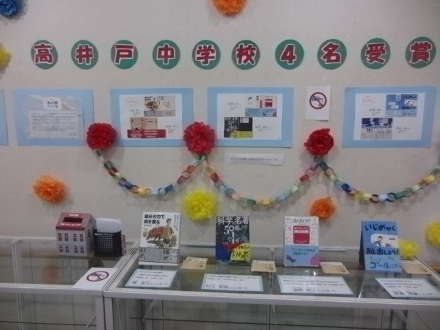 | 隣接している高井戸図書館に、2年生の「本の帯」の作品が展示されています。ここに展示されている作品は、昨年度の「杉並区本の帯コンクール」で入選した作品です。「本の帯」は国語科の授業で作成しました。デザインや、キャッチコピー等、それぞれ趣向が凝らされています。高井戸図書館にお立ち寄りの際は、ぜひご覧ください。 |