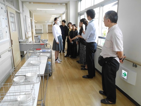 窓から調理室の中を視察したり、給食当番の配膳や食事の様子を見学したりし、生徒から感想も聞きました。