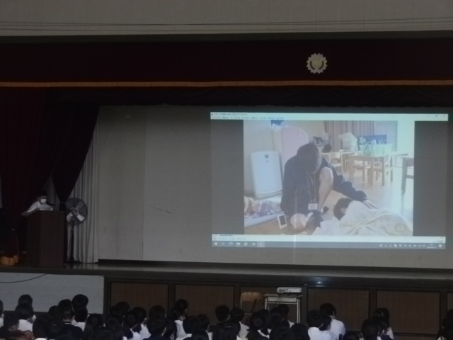 講義では、時間の経過で低下してしまう救命のチャンスを表す救命曲線の説明を聞いたり、疾病者の発生現場から病院に搬送されるまでにできる応急処置の仕方を学んだりしました。