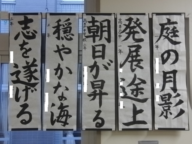 職員室前に冬休みの宿題だった書き初めを展示しています。各学年の優秀な作品を展示しています。ご来校時にご鑑賞ください。