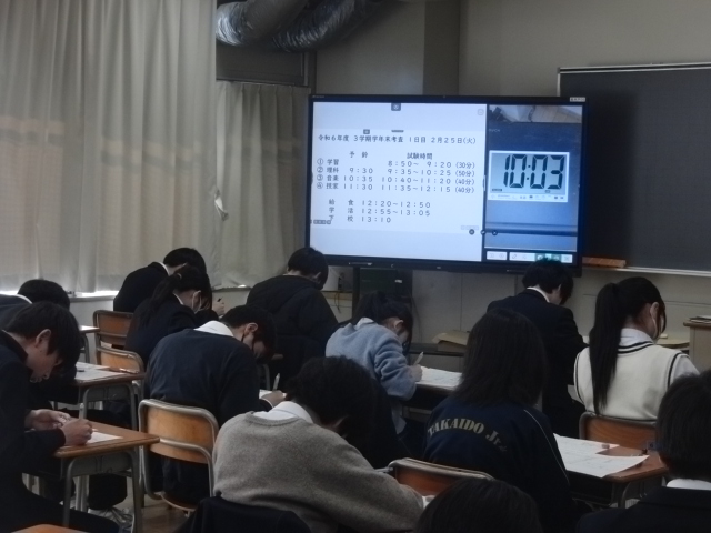 今日から学年末考査が始まりました。1日目は理科、音楽、技術家庭。2日目は数学、英語、保健体育。3日目は国語、社会、美術です。普段の力を発揮してください。また、提出物は来週ぐらいまでに提出になっていると思います。忘れないようにしましょう。