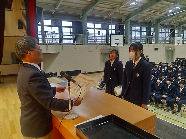 今日は令和6年度の修了式と離任式を行いました。修了式では校長から入学式や始業式で話した、「やる気」「根気」そして「本気」について、振り返って進級してほしいという話しでした。離任式では定年退職の教員の紹介、退職と任期満了の職員の紹介、転出する教員9名の紹介とお話をいただきました。離任する先生からは高中での思い出などや前向きに取り組んでほしいなどという温かいお話でした。私(校長)も4年間という短い時間でしたが、「常に生徒が楽しい」と思えるような学校経営に取り組んできました。ご協力いただいた地域の方やPTAの皆様ありがとうございました。これからも高中を支えていただければと思います。また、高中日記も4年間一日も休まずに投稿してきました。ご覧いただきありがとうございました。