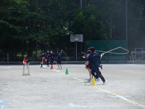 3年の体育で体育大会の団体種目「5人でジャンプ」の授業を行っていました。 来週から体育大会の練習が始まります。