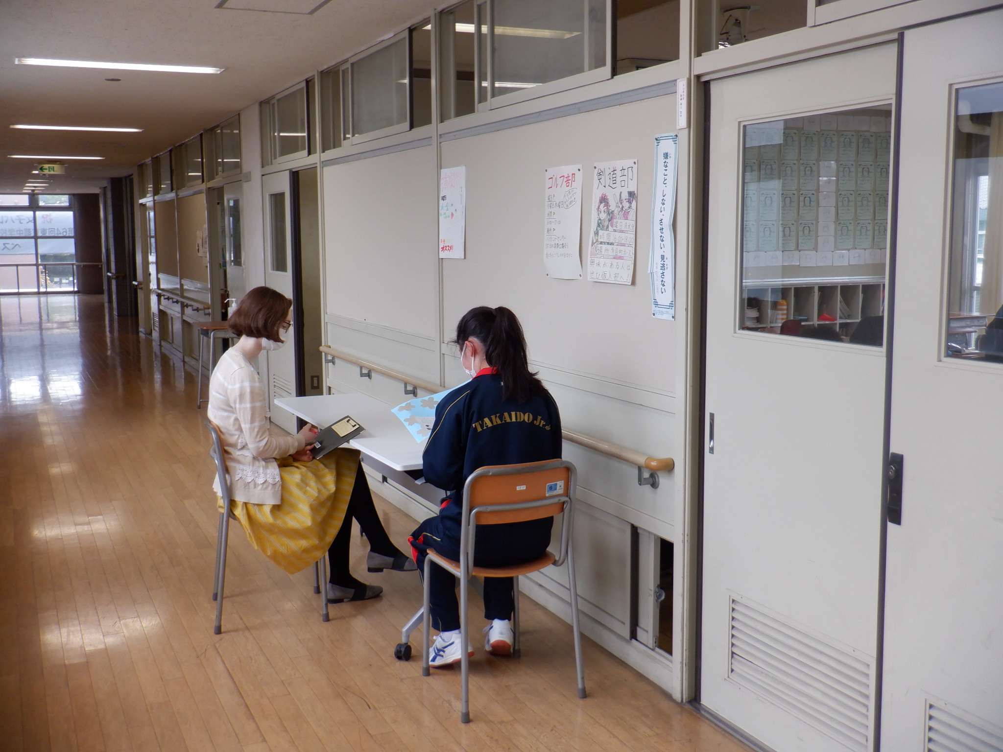 1年英語の授業でALTの先生が生徒一人一人にreadingのテストを行っています。