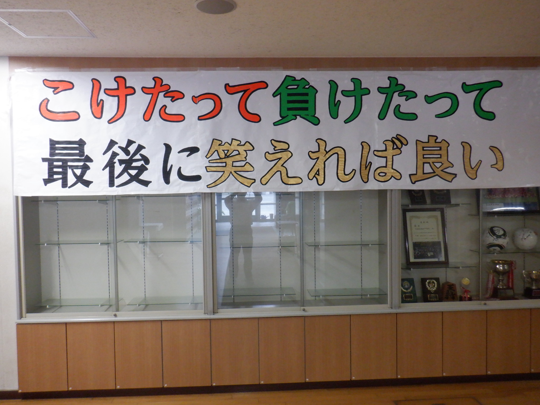 明日は体育大会です。天気予報も晴れに変わりました。体育大会スローガンを美術部が作成し、素晴らしい横断幕になりました。また、各クラスのスローガンも作成しました。