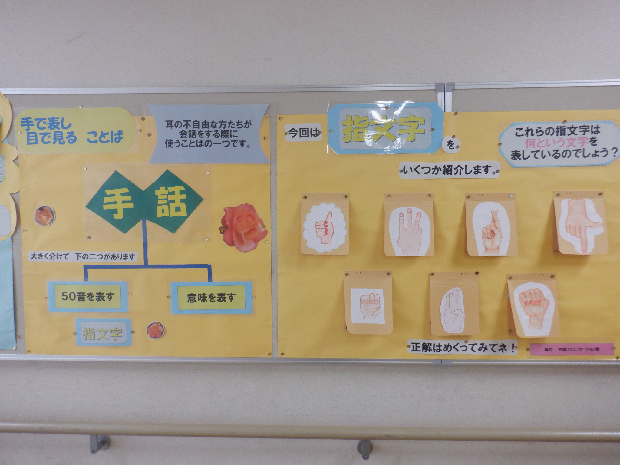 | 本校には難聴学級(聞こえの教室)が併設されています。聞こえの教室の前に手話の掲示物があります。手話は大きく分けて、50音を表すものと意味を表すものがあります。今回は50音を表す指文字を掲示しています。指文字にチャレンジしましょう! |