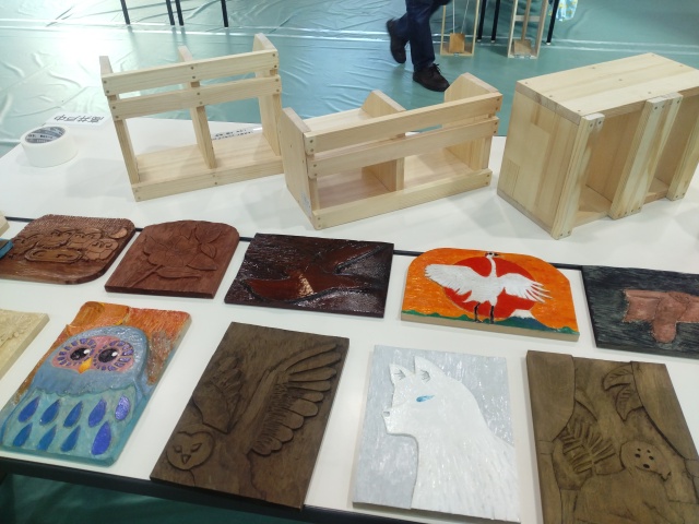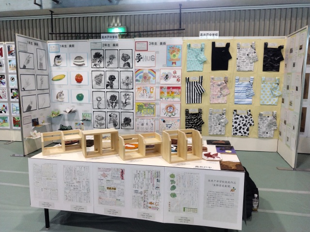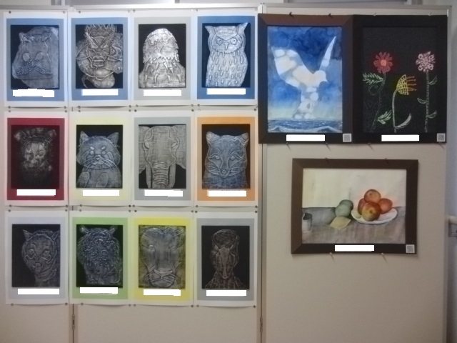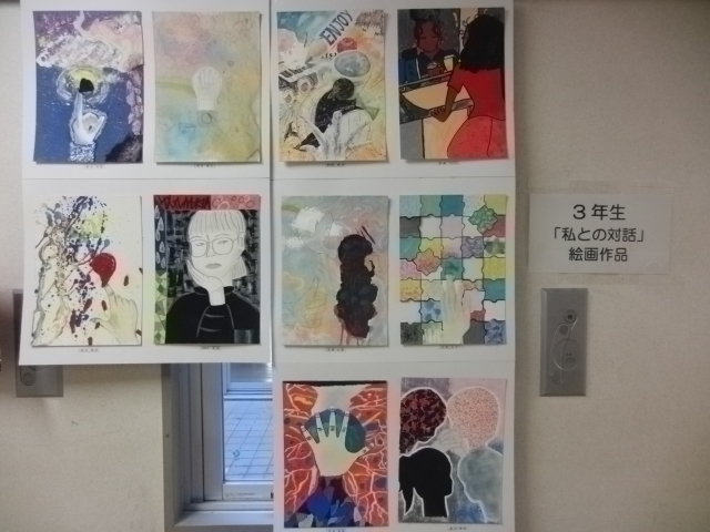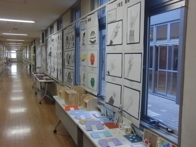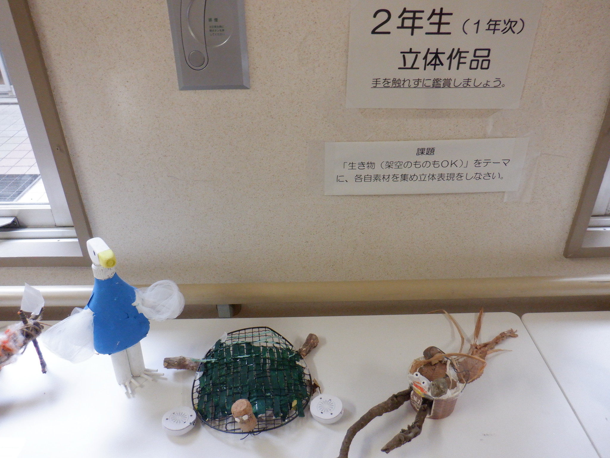 昨年度2年生が作成した美術の作品を職員室前に展示しています。生き物をテーマに各自で素材を集め、立体表現した作品です。
