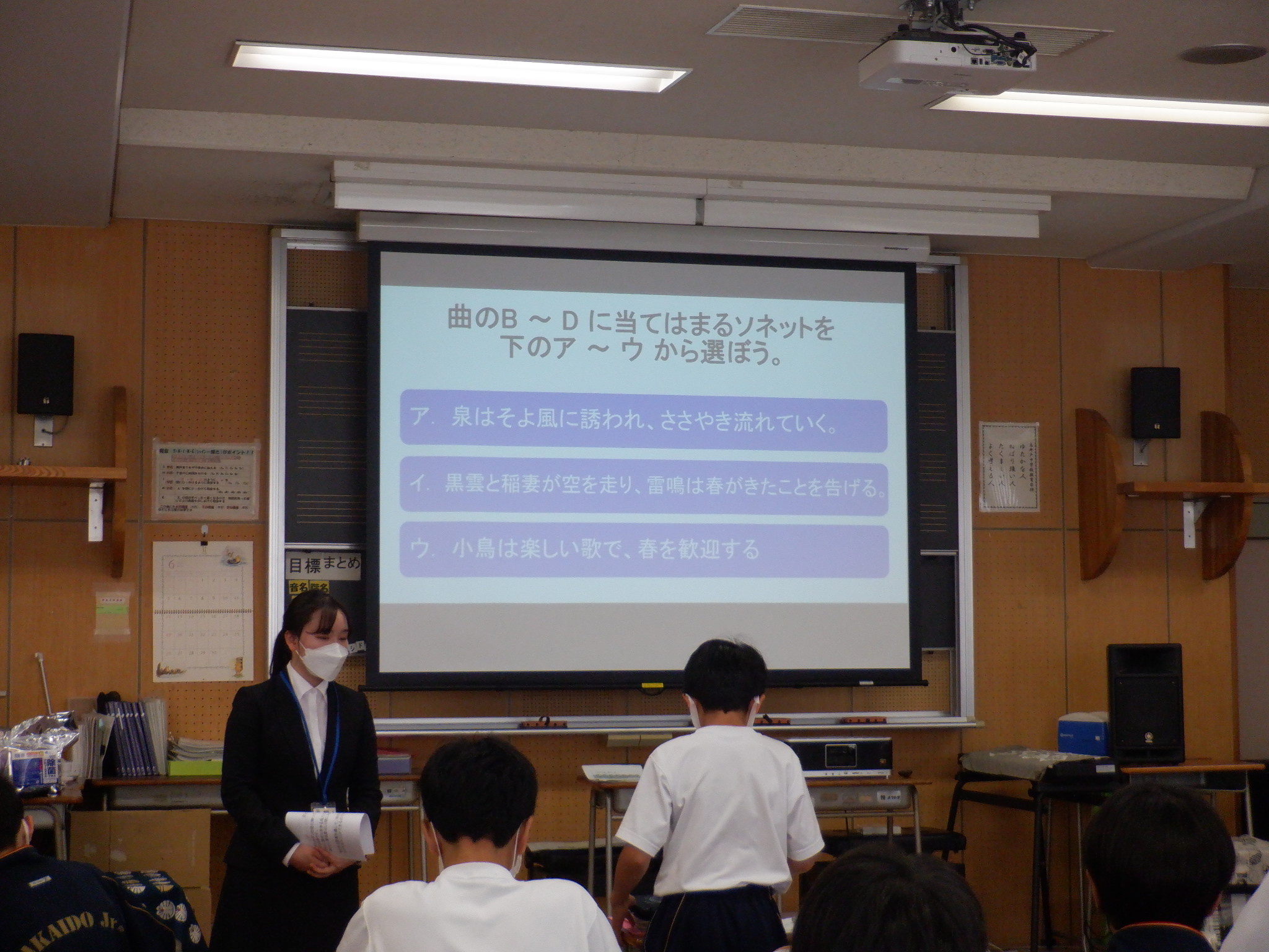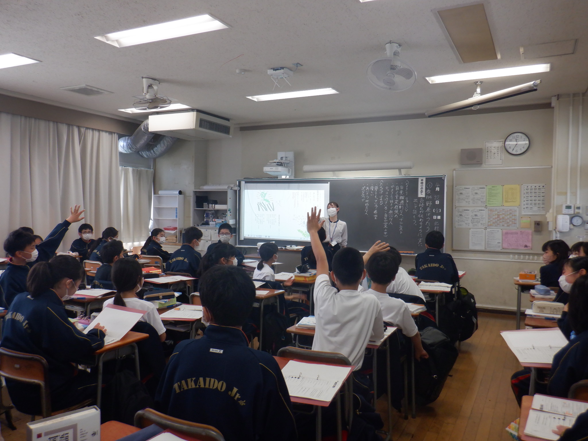 | 1年生の国語では「野原はうたう」の題材を使用し、音読の学習をしました。相手を意識し、声の大きさや気持ちをこめて音読をしました。たくさんの生徒が手を挙げて発表しています。 |