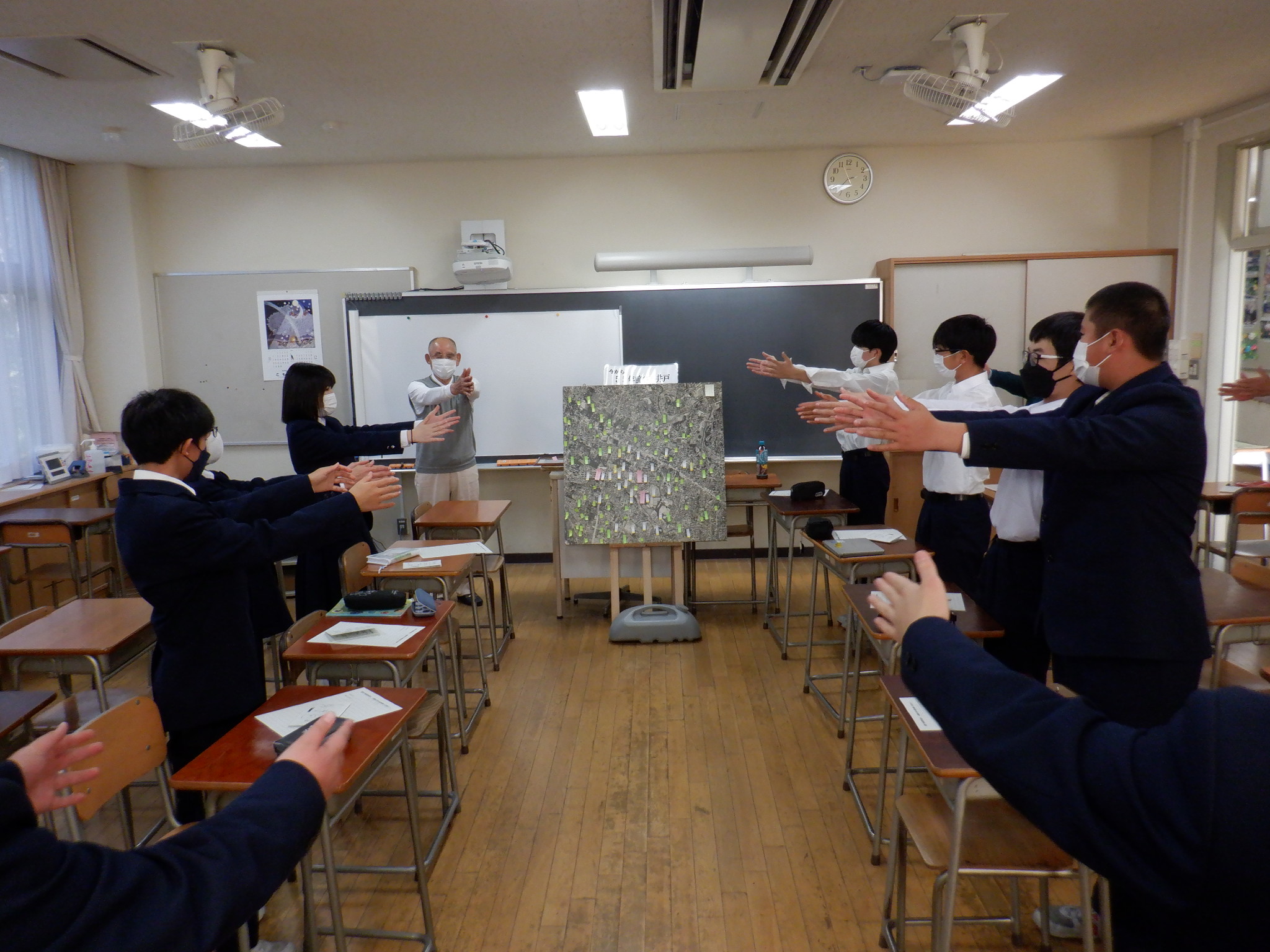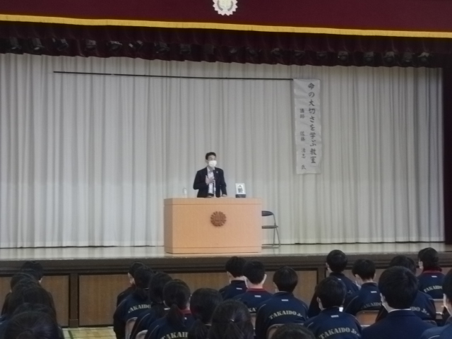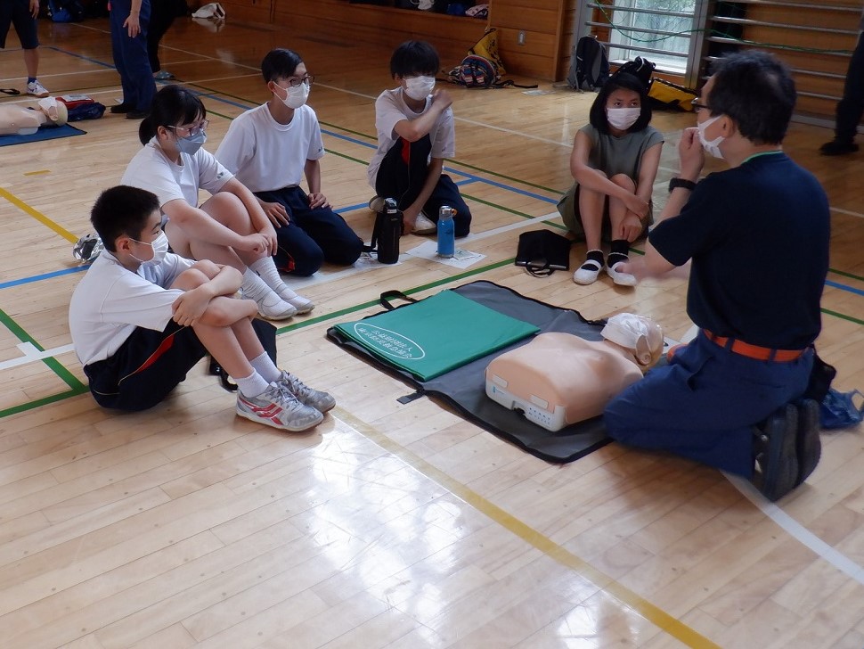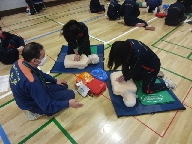 3年生は午前中に体育館で普通救命講習会を実施しました。心肺蘇生の仕方やAEDの使い方などを学習しました。心臓マッサージや人工呼吸を実際に行い、必死に胸部を30回圧迫し、すぐに人工呼吸で2回吹き込む動作を体験しました。