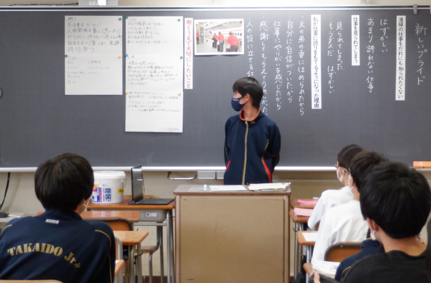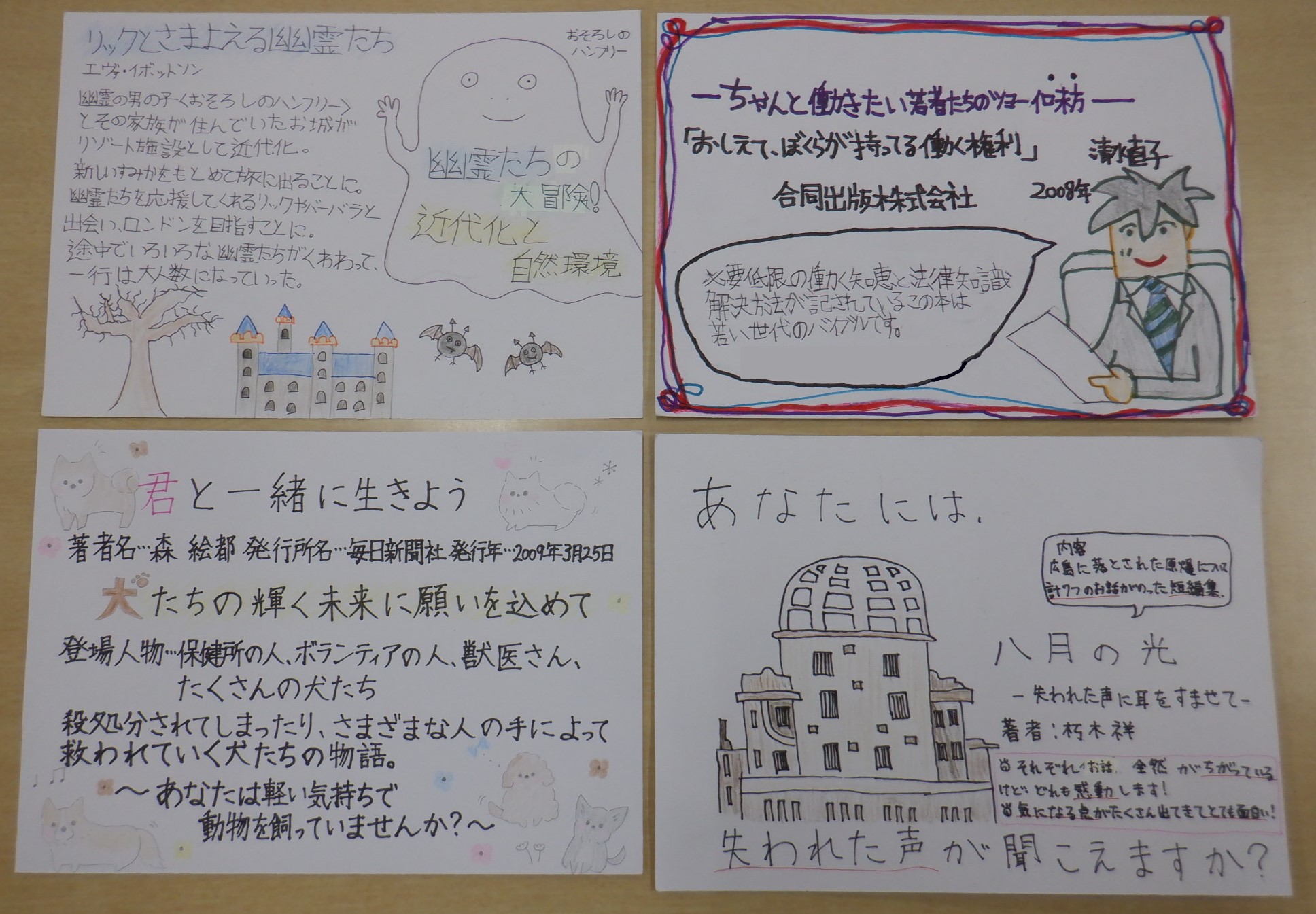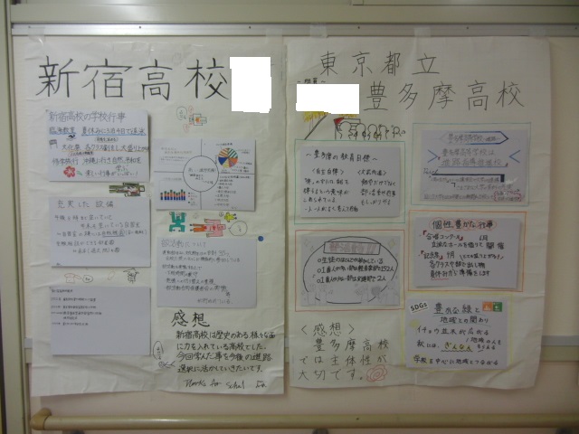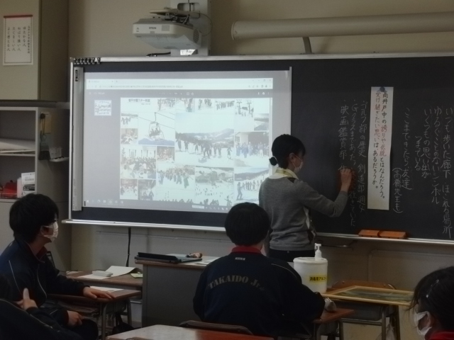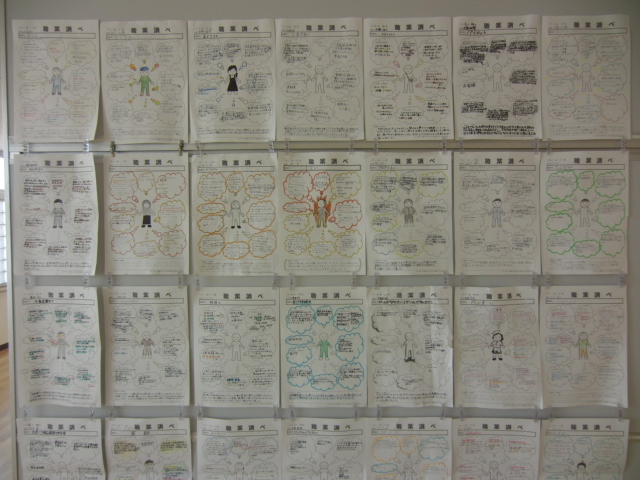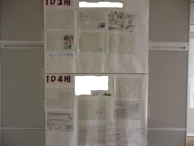 1年生は2階のオープンスペースに総合的な学習で行った職業調べを掲示してあります。職業のリストから自分が調べたい職業を調べました。2年生はスキー教室の写真を特活4に掲示してあります。明日の保護者会で鑑賞してください。