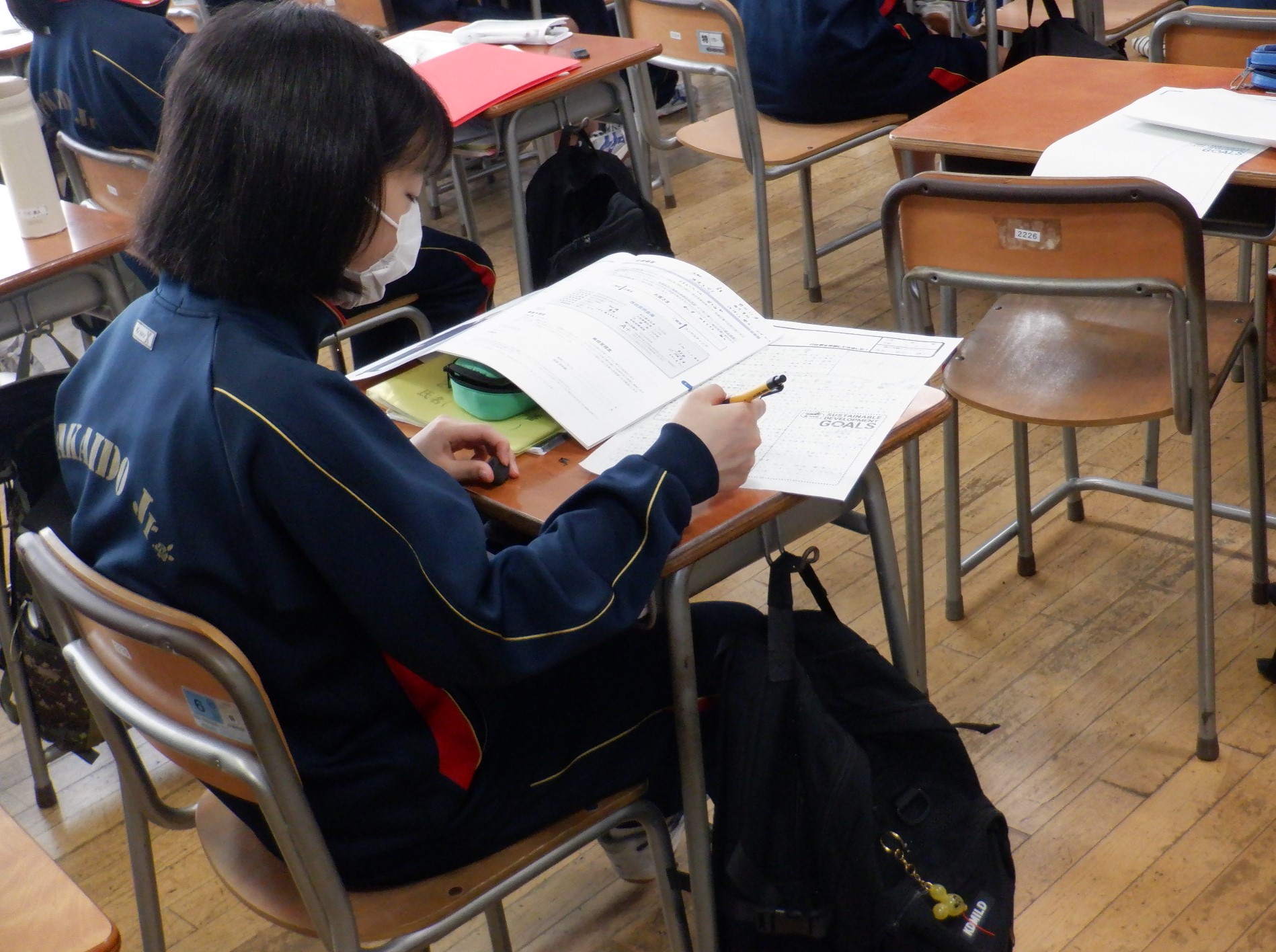 明日から、学年末考査です(3年生は明後日から)。考査に向けて、毎回、学校支援本部が講師の先生を招いてくれたり、自習室を運営してくれたりしています。そのおかげで、今日も生徒は真剣に学習に打ち込むことができました。成果が出せるように願っています。
