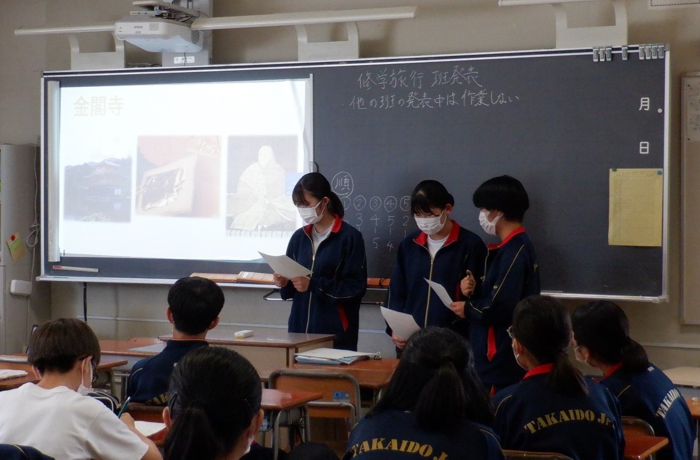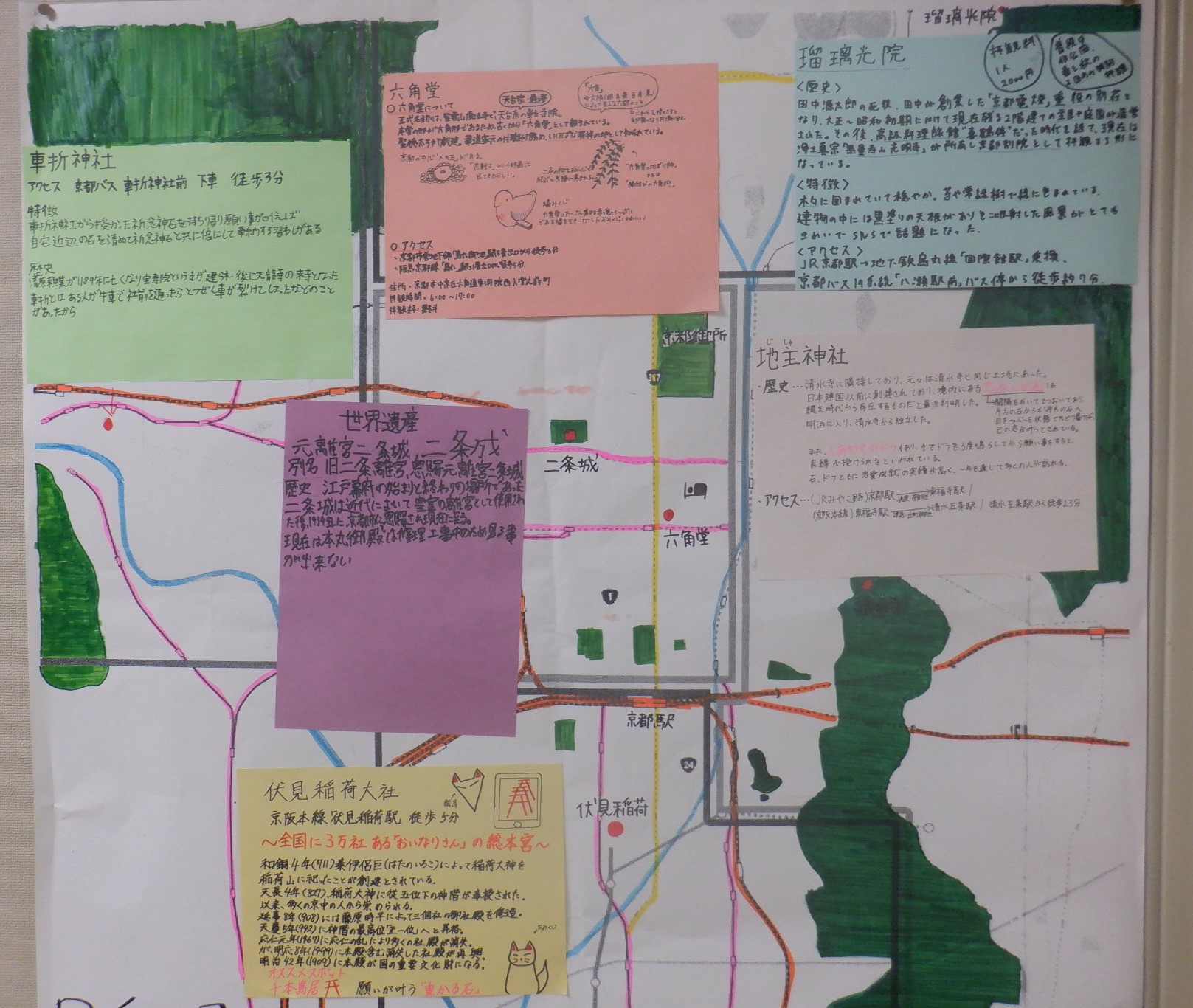3年生は、6月30日から7月1日に実施する修学旅行に向けて、事前学習を始めています。この地図は、京都をエリアごとに分けて作った「班別行動模擬マップ」です。自分たちが訪れたいところを調べ地図上に示しました。心は、もう京都です。