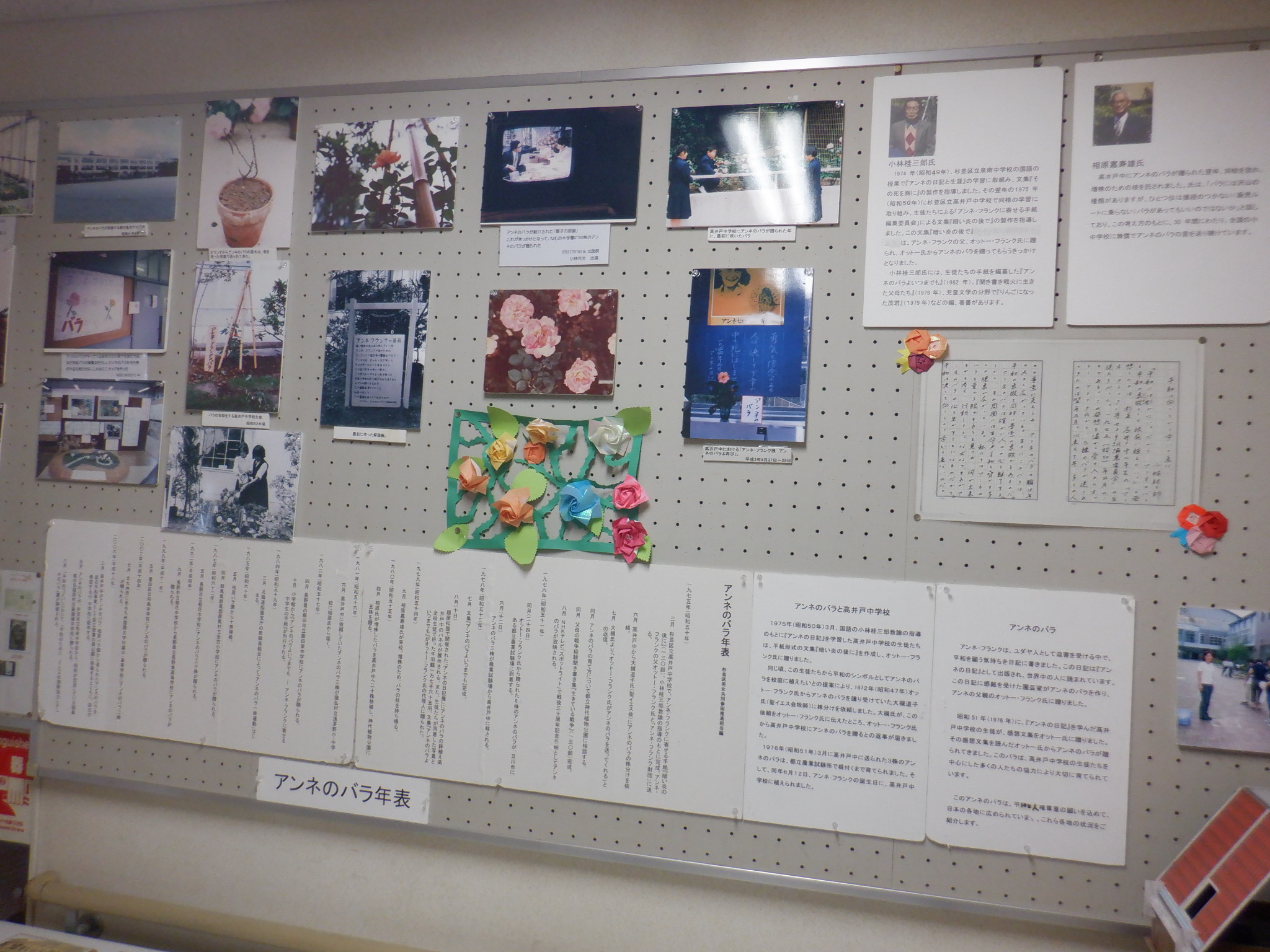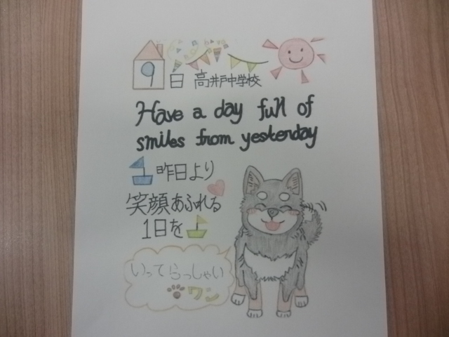 写真の作品は、本校生徒が作成しました。校門横の掲示板に飾っています。ぜひご覧ください。(早速地域の方が足を止めてくださり、お褒めの言葉をいただきました。ありがとうございます。)