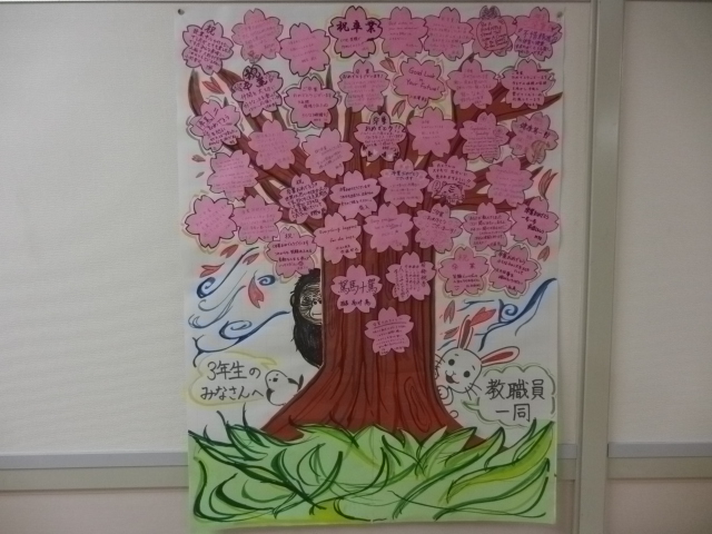 東京も昨日、桜の開花宣言がありました。校庭や正門の桜も開花し始めています。3年生の教室の前には1・2年生のクラスや教職員から桜のメッセージが満開です。