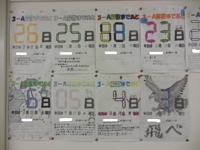 また、卒業までのカウントダウンも3年生が作成し、掲示してあります。卒業式まであと3日!素晴らしい卒業式になると思います。