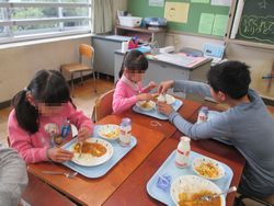 ビン牛乳の開け方など、難しいことは5年生が優しく手を添えて、手伝ってくれたり教えてくれたりしました。優しいお兄さん、お姉さんに、緊張していた子も、少しずつ安心し、おしゃべりも楽しめるようになっていました。
