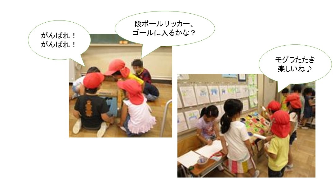 6月中旬、久我山小学校2年生のミニ久我山まつりに遊びに行きました。3人〜4人の班をつくり、2年2組と3組に分かれて小学生の手作りの遊び場(ブーメラン・モグラたたき・紙コップロケット・やじろべえ等)で楽しく遊びました。サッカーやモグラたたきでは、2年生に「がんばれ!がんばれ!」と一生懸命応援してもらったのが、とても嬉しかったようです。