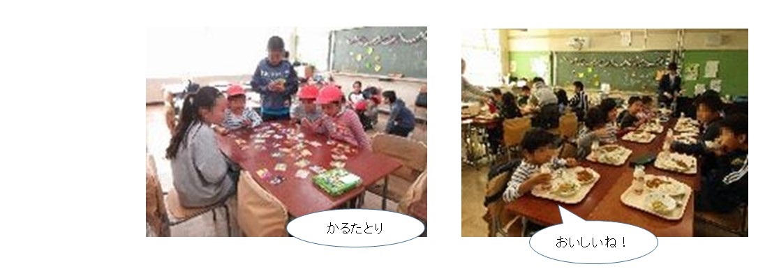 久我山小学校5年生・久我山東保育園・あい保育園の年長組さんと一緒に交流活動をしました。グループに分かれて5年生と一緒に遊びました。それぞれのグル―プで、お兄さんお姉さんが優しく遊び方を教えてくれました。給食も食べました。メニューはカレーとサラダでした。おかわりをしている子も大勢いました。