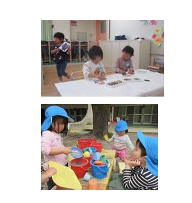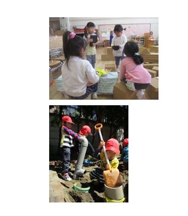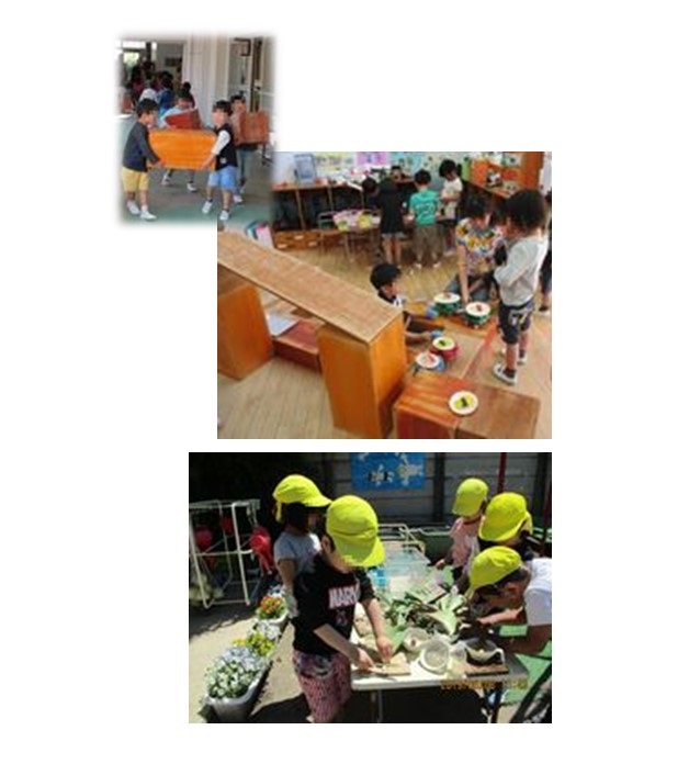 友達と同じものを作りたいという気持ちが出てきています。「これを作りたい!」「これで遊びたい!」という思いがたくさん見られるようになっています。友達の様子にも気付いて、同じ場で一緒に過ごしたり、同じものを作って遊んだりする楽しさも感じています。